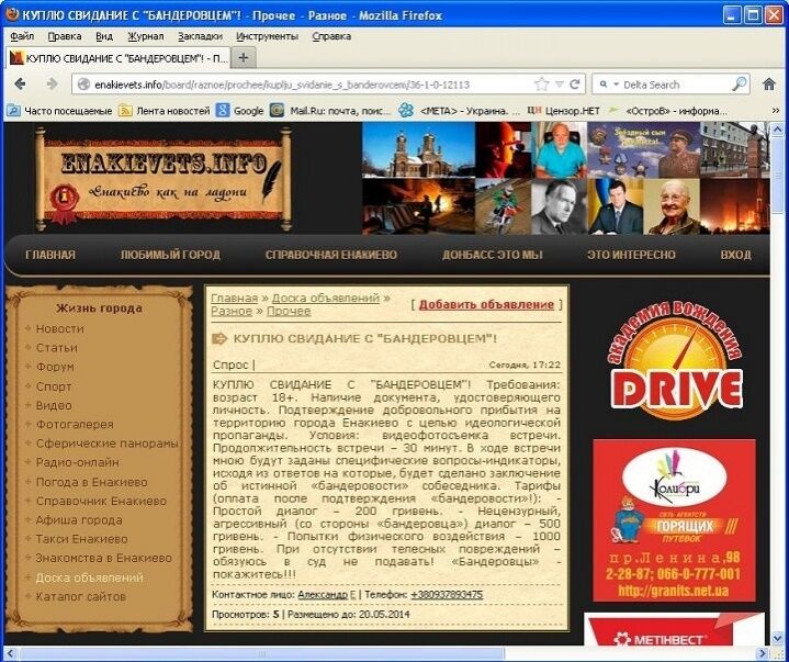 "Требования: Возраст 18+. Наличие документа, удостоверяющего личность (желательно и партбилета украинской националистической политорганизации). Подтверждение добровольного прибытия на территорию города Енакиево с целью идеологической пропаганды. Условия: Фото- и видеосъёмка встречи. Продолжительность встречи – 30 минут. Если встреча прерывается по желанию "бандеровца" – оплата не производится. Дополнительное время встречи, инициированное "бандеровцем" – не оплачивается. В ходе встречи мною будут заданы специфические вопросы-индикаторы, исходя из ответов на которые, будет сделано заключение об истинной "бандеровости" собеседника. Отказ отвечать на вопросы – аннулирует все финансовые обязательства. Тарифы (оплата после подтверждения "бандеровости"): – Простой диалог – 200 гривен. – Нецензурный, агрессивный (со стороны "бандеровца") диалог – 500 гривен. – Попытки физического воздействия – 1000 гривен. При отсутствии телесных повреждений – обязуюсь в суд не подавать! Свидание: "тет-а-тет". Присутствие третьих лиц и фото- и видеосъёмка ими – возможны и оговариваются индивидуально! "Бандеровцы" – покажитесь!!!"