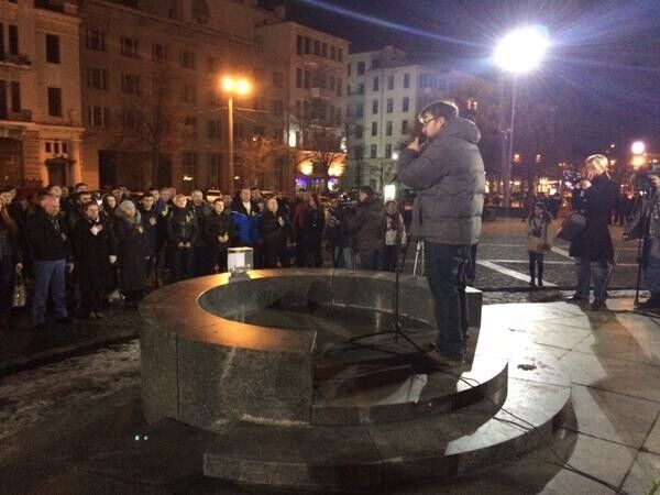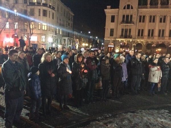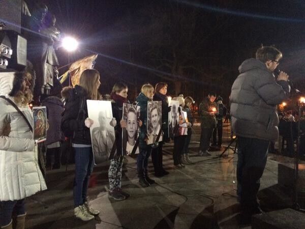 Около 18.00 во вторник, 24 февраля, возле памятника Тарасу Шевченко в центре Харькова начался митинг-реквием в память о погибших в результате воскресного теракта милиционере Вадиме Рыбальченко и троих активистах – Игоре Толмачеве, Данииле Дидике и Николае Мельничуке. На митинг собрались несколько десятков человек. В руках они держат портреты погибших харьковчан.