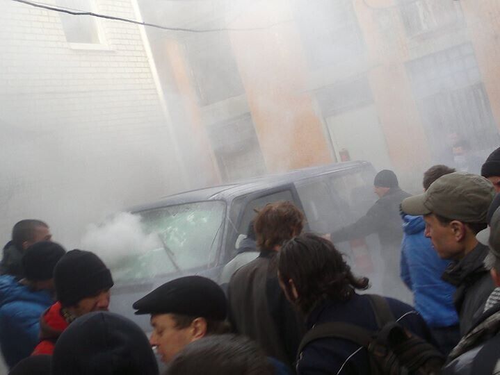 "Люди с георгиевскими лентами прорвались во двор. Бьют стекла, выбрасывают из окон символику "Правого сектора". Синий "фольксваген", что стоял во дворе, сначала перевернули, побили окна и фары, после подожгли", – написал Мавричев.
