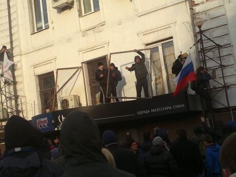 Перед зданием пророссийские активисты сожгли символику "Правого сектора", книги по истории Украины и Голодомору. Пикетчики с георгиевскими лентами скандируют: "Россия, Харьков!". Среди толпы видны флаги запрещенной экстремистской организации "Оплот".