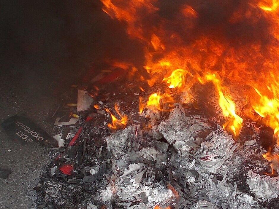 Молодые люди спортивной внешности жгут символику "Правого сектора", книги по истории Украины и Голодомору.