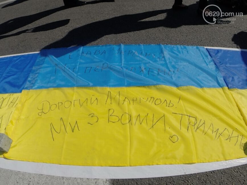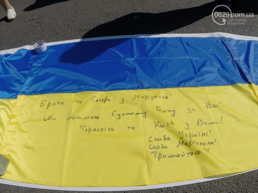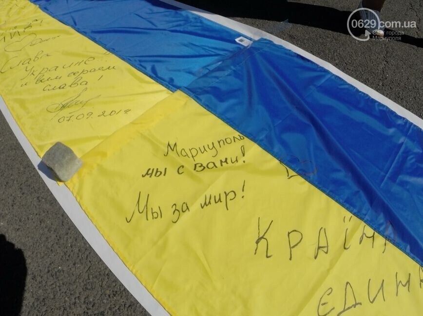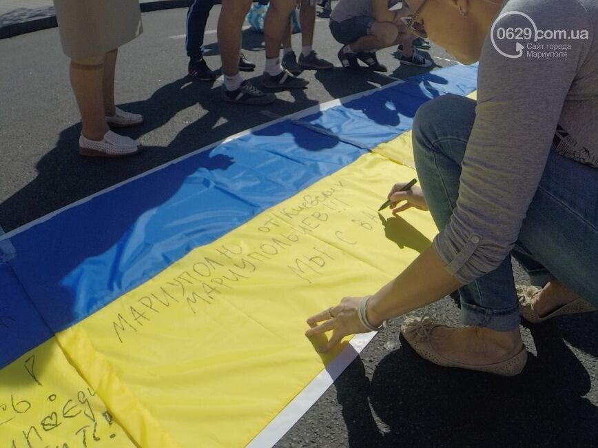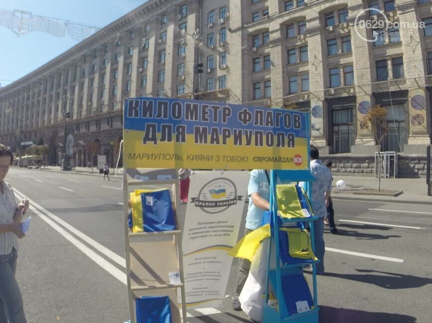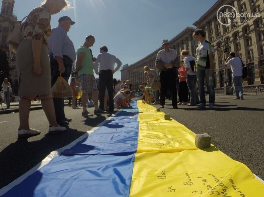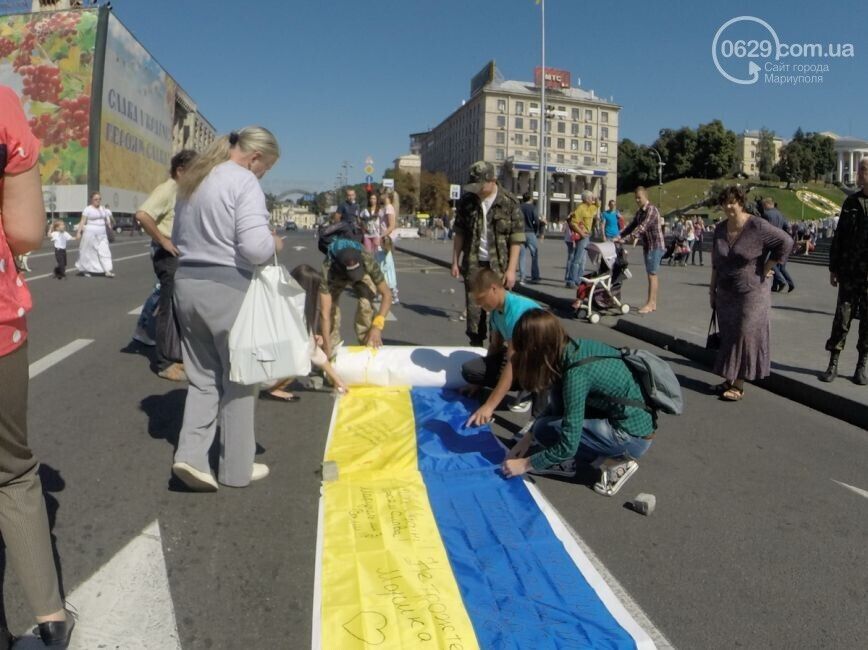 Акция "Километр флагов для Мариуполя" состоялась сегодня, 7 сентября, в столице Украины. Жители Мариуполя и киевляне сложили на асфальте длинный желто-синий флаг, пишет 0629.com.ua. Все желающие писали мариупольцам пожелания: "Мариуполь, мы с вами, мы за мир!", "Мариуполь – это Украина!". Во время акции можно было за 50 грн купить флаги, которые сделали беженцы из Мариуполя. Часть средств пойдет на помощь раненным в зоне АТО.