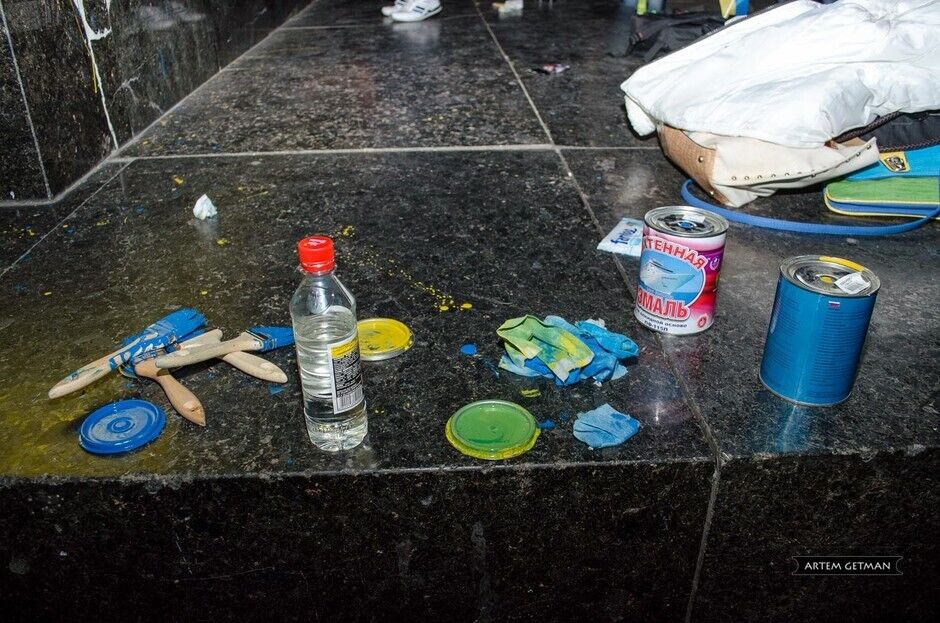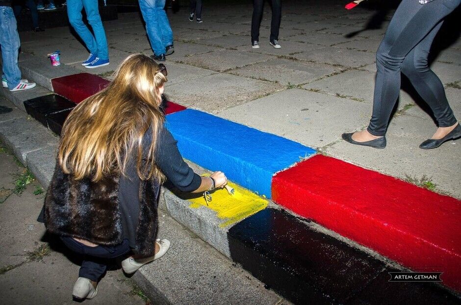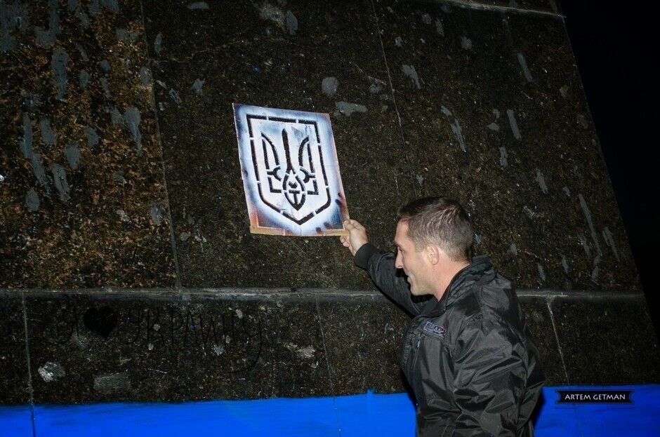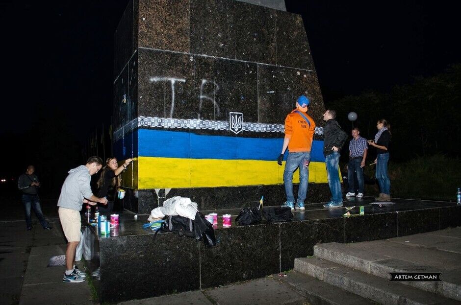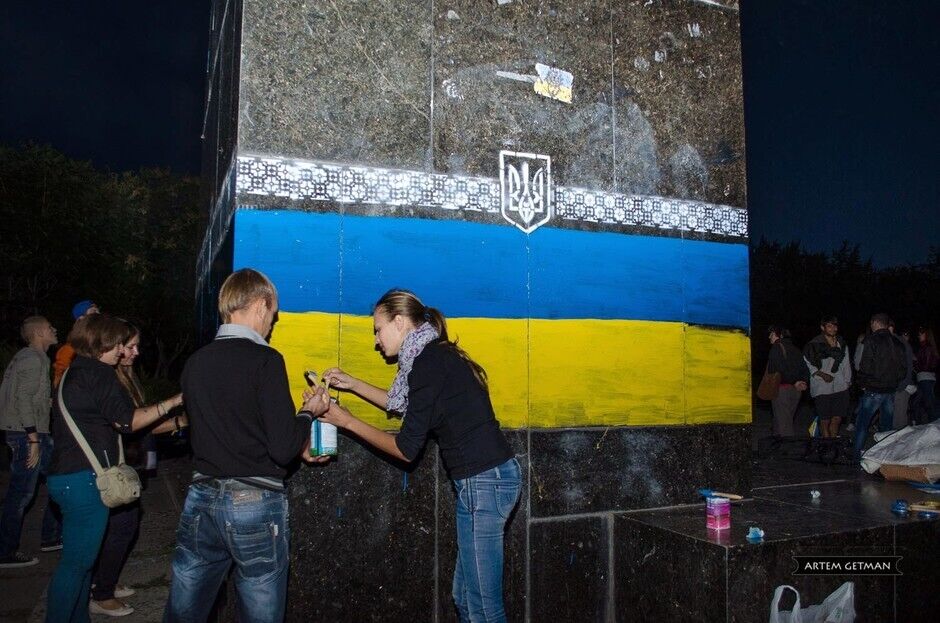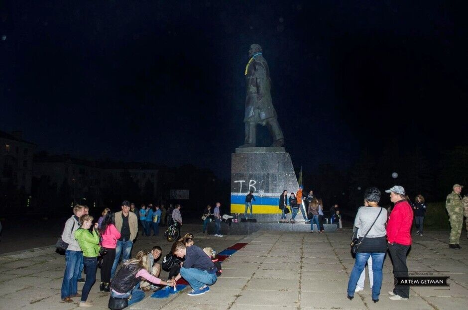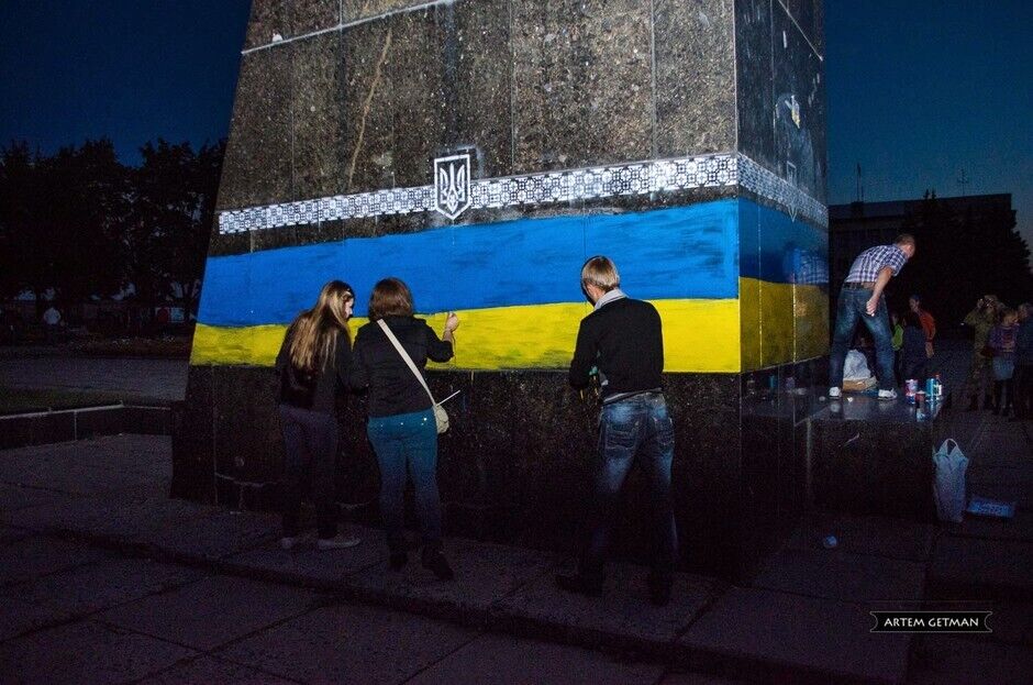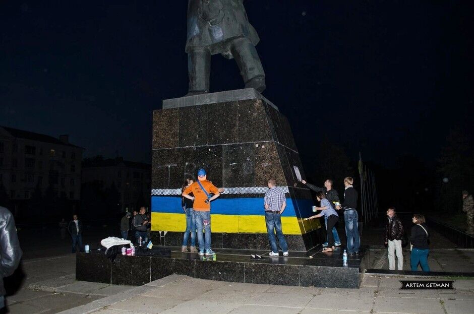 Молодежь раскрасила постамент памятника Ленину сине-желтыми цветами в освобожденном от террористов Краматорске. Кроме того, молодежь также разрисовала памятник граффити с трезубцем и орнаментом, а ступени у постамента – в цвета национального флага и флага Украинской повстанческой армии.