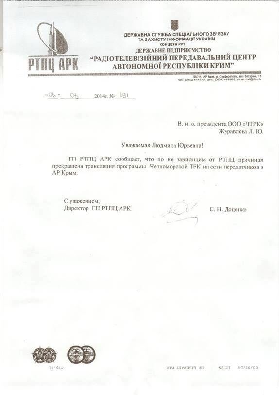 Вскоре представители радиотелевизионного передающего центра сообщили, что получили информацию об угрозе жизни журналистам "Черноморской" и, чтобы избежать этого, решили самостоятельно отключить телерадиокомпанию.