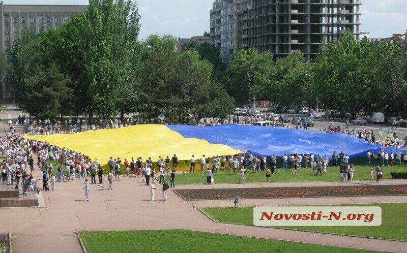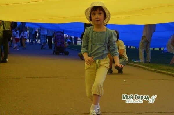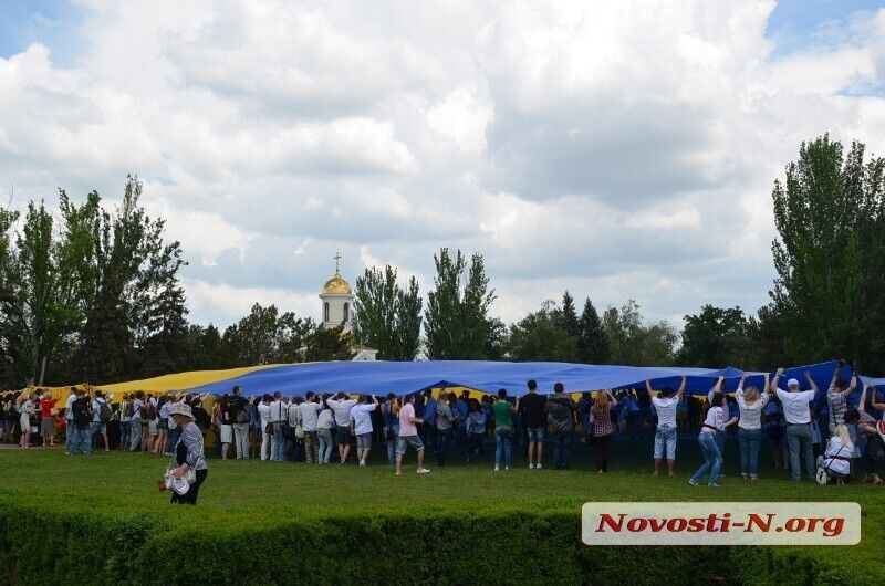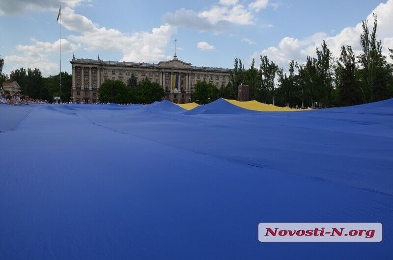 Николаев стал седьмым городом, где развернули гигантский флаг. Национальный символ площадью 2400 м² и весом в 300 кг занесен в Книгу рекордов Гиннеса. Организаторы посвятили акцию героям Небесной сотни.
