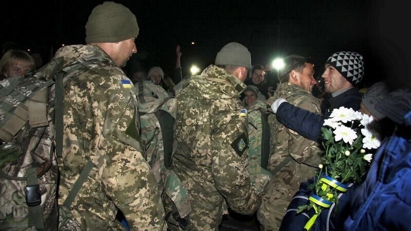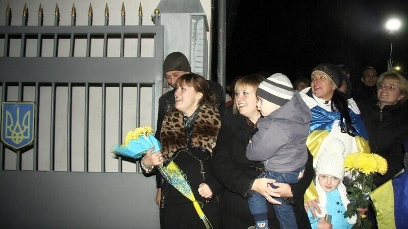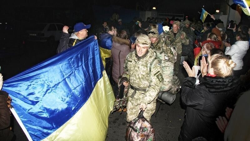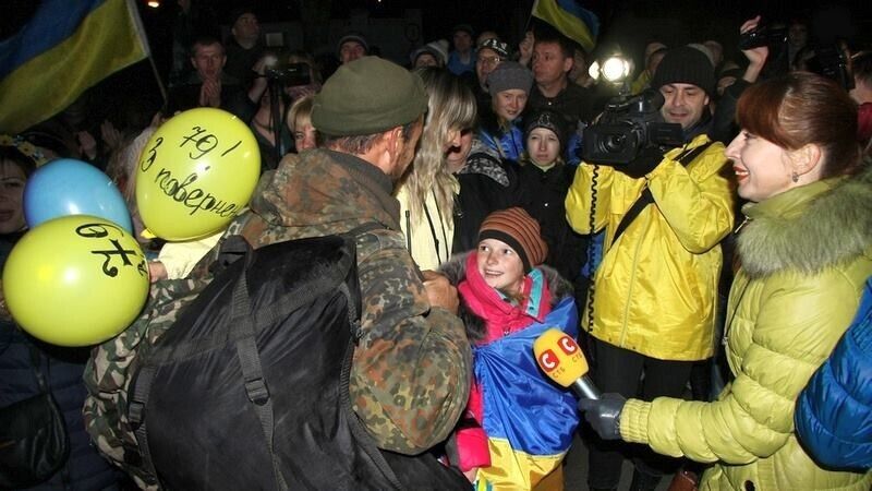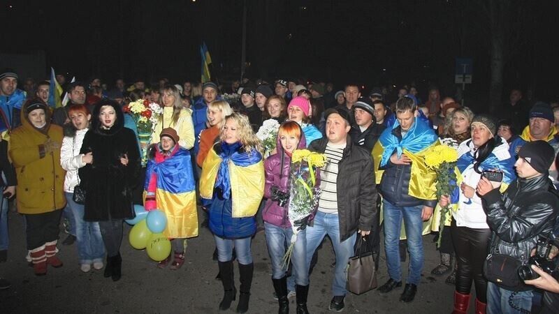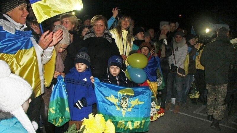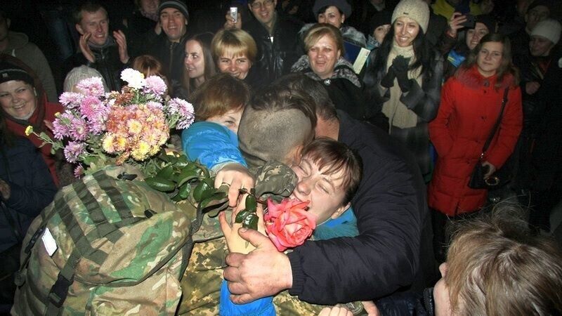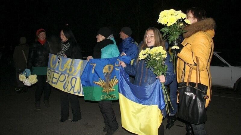 В Николаеве торжественно встречали десантников, которые вернулись из зоны АТО по ротации. Среди встречающих было множество людей с украинскими флагами. Воинов дожидались родные и друзья.