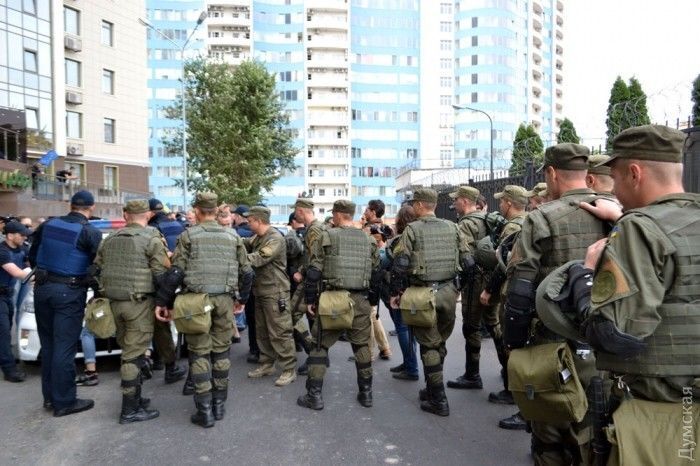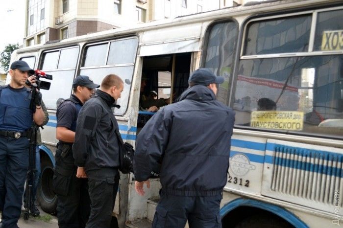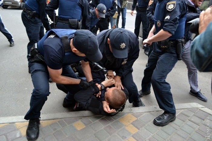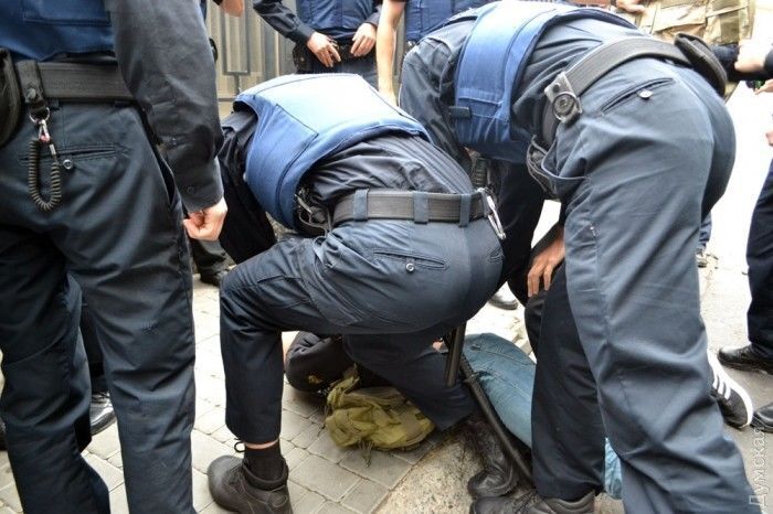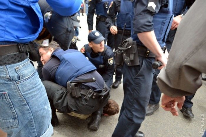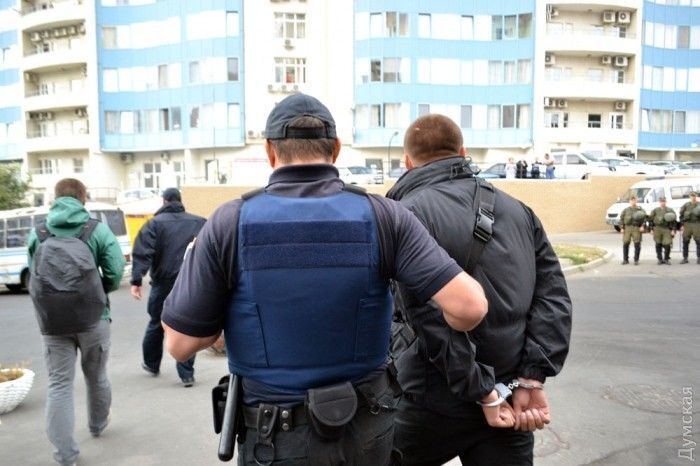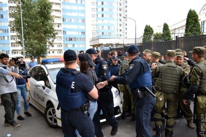 Дежурившая у стен здания полиция вмешалась в ситуацию, в результате чего началась потасовка. Активисты "Правого сектора" были в меньшинстве, полицейские задержали трех человек, в том числе руководителя одесской ячейки организации Сергея Стерненко. Задержанных увезли в отдел полиции.