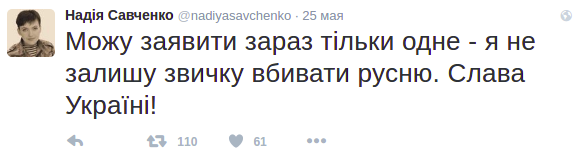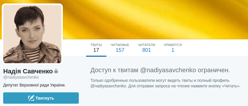 В Twitter появился аккаунт, якобы принадлежащий украинской военнослужащей Надежде Савченко. Одно из первых сообщений в этом аккаунте – обещание "не оставлять привычку убивать русню".