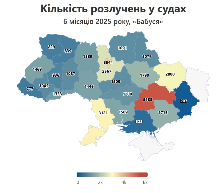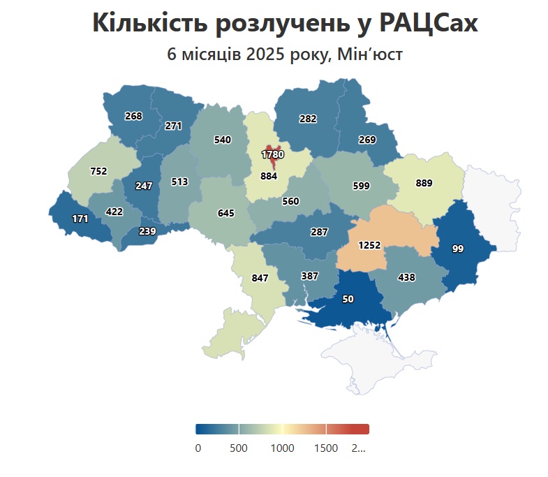 В тройку регионов с наибольшим количеством разорванных через суды браков, информация о которых есть в реестре, вошли также Киев (3544 решения) и Одесская область (3121).