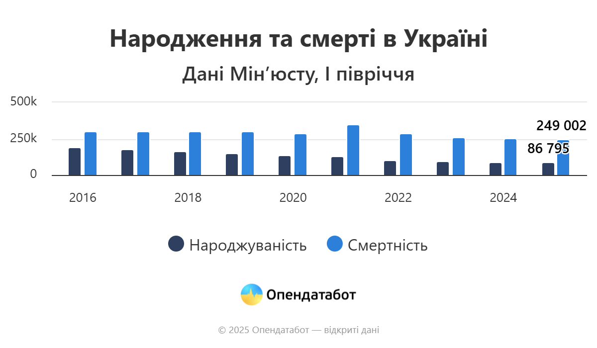 Согласно информации ведомства, в первом полугодии 2025 года в Украине зафиксировано 86 795 новорожденных и 249 002 умерших.