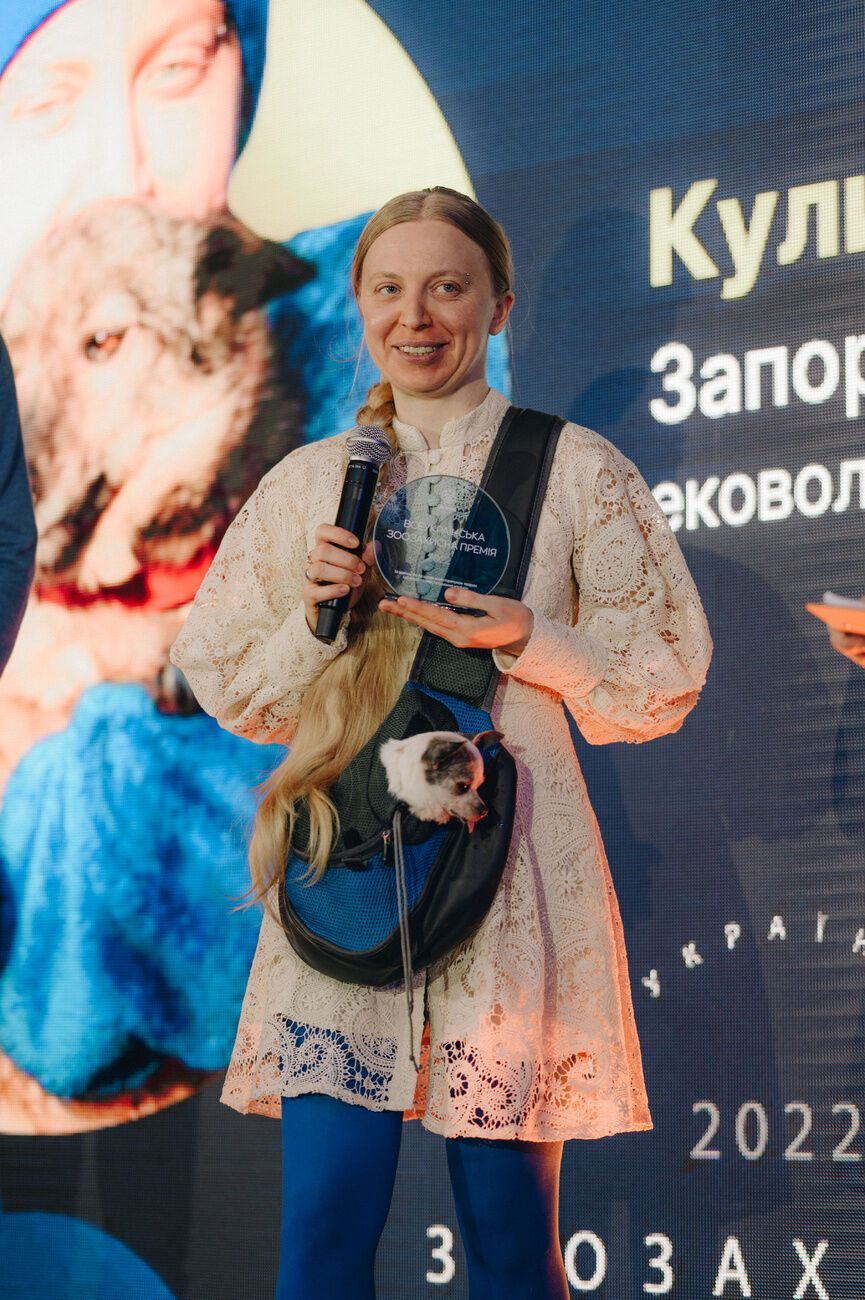 Ася Серпинская (Гостомель, Киевская область). Занимается зооактивизмом 23 года. Нашла семьи для более чем 5000 животных, а сейчас ухаживает за более чем 500 собаками и кошками. С начала войны принимает в гостомельском приюте животных с прифронтовых территорий.