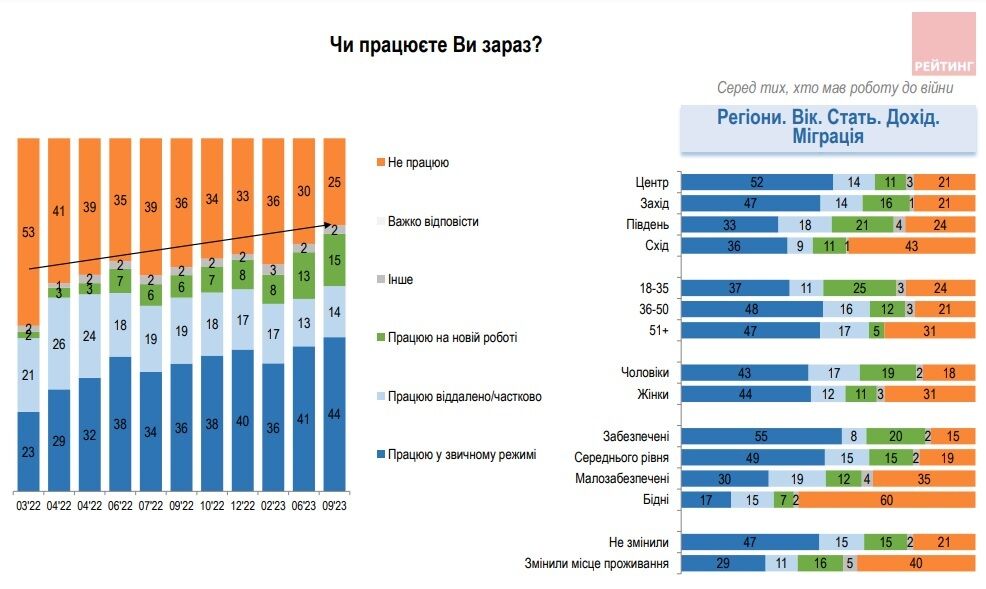 "Наблюдается уменьшение тех, кто не имеет работы. Относительно лучше ситуация с работой у жителей центра и запада, мужчин, молодежи и людей среднего возраста, более обеспеченных. Среди переселенцев в динамике возросло количество закрепившихся на новых рабочих местах и работающих в привычном режиме, доля неработающих среди них по сравнению с началом 2023 года уменьшилась с половины до 40%", – объяснили в "Рейтинге".