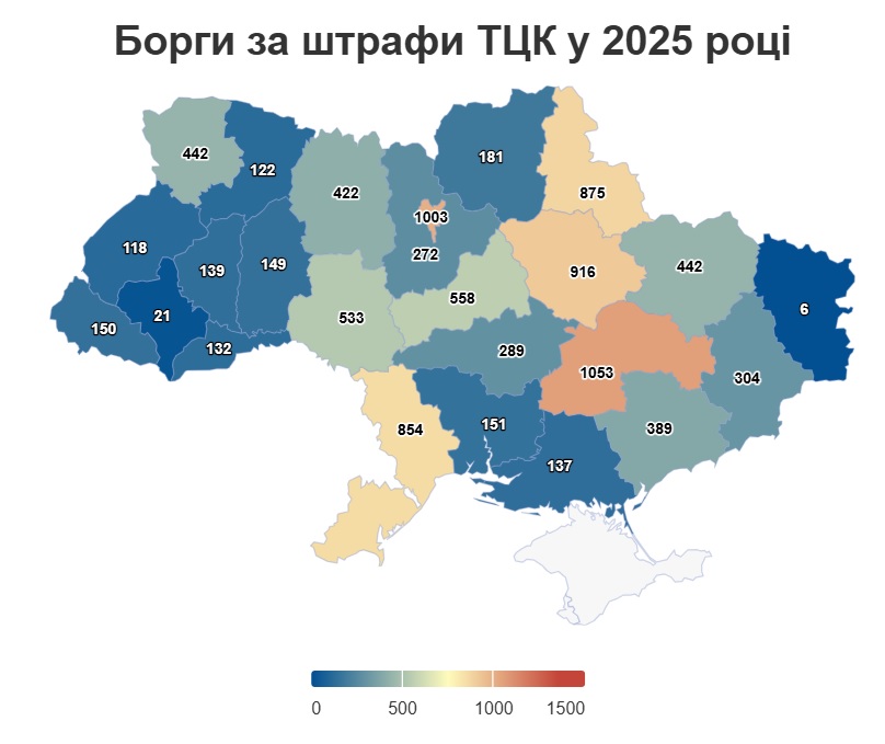 По его данным, наиболее активно в 2025 году за долги перед ТЦК штрафуют в Днепропетровской области (1053 производства), Киеве (1003) и Полтавской области (916).