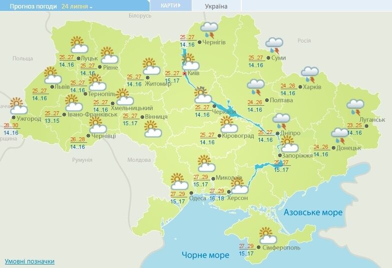 24 июля в восточной части Украины и на севере Левобережья синоптики прогнозируют дождь и грозу.