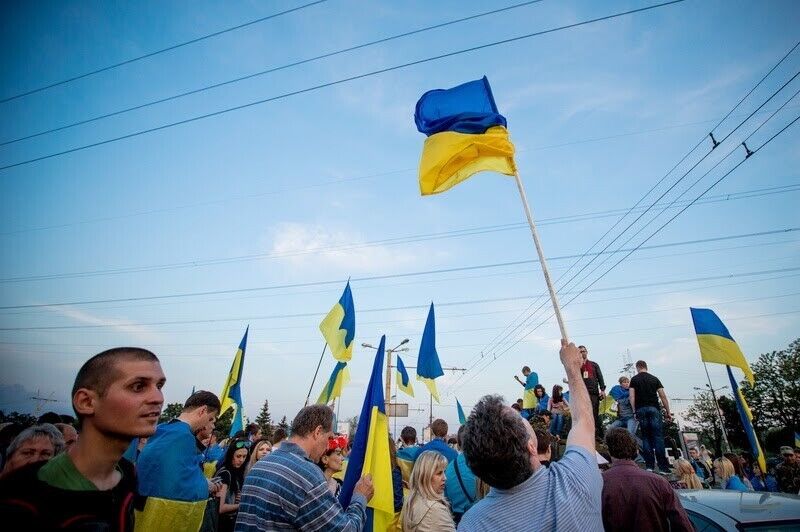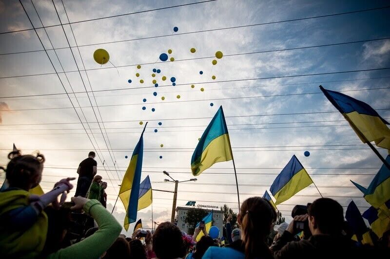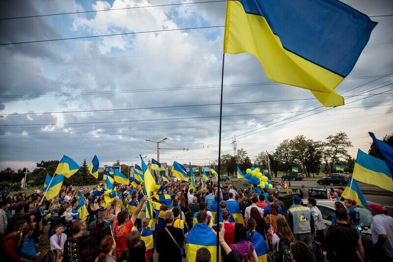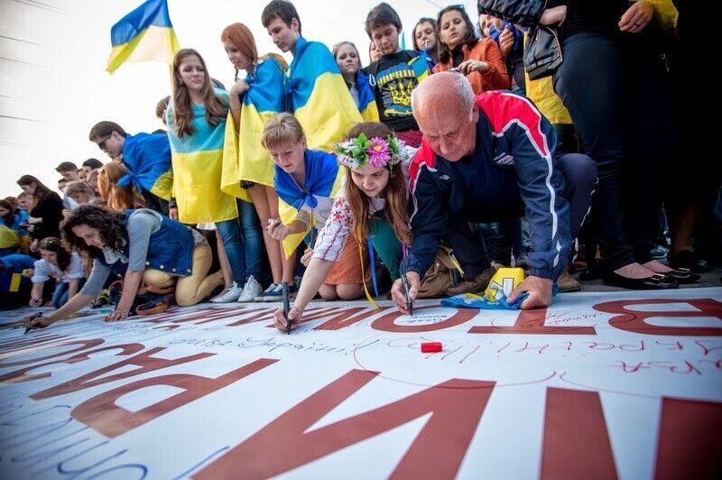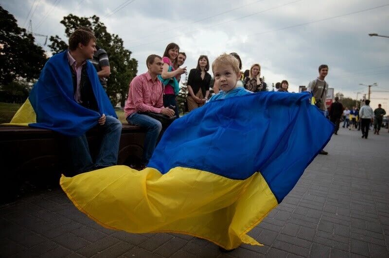 Вечером 14 мая около тысячи жителей Запорожья вышли на улицы в вышиванках, с государственными флагами Украины и желто-голубыми воздушными шарами в поддержку единства Украины. В ходе акции казаки Хортицкого полка Запорожья устроили представление с саблями и призвали земляков пополнять ряды самообороны. Активисты провели конкурсы для детей, оставили подписи на семиметровом плакате "Мы вместе!" и выпустили в небо желто-голубые воздушные шары. Завершил парад автопробег украшенных национальной символикой автомобилей.
