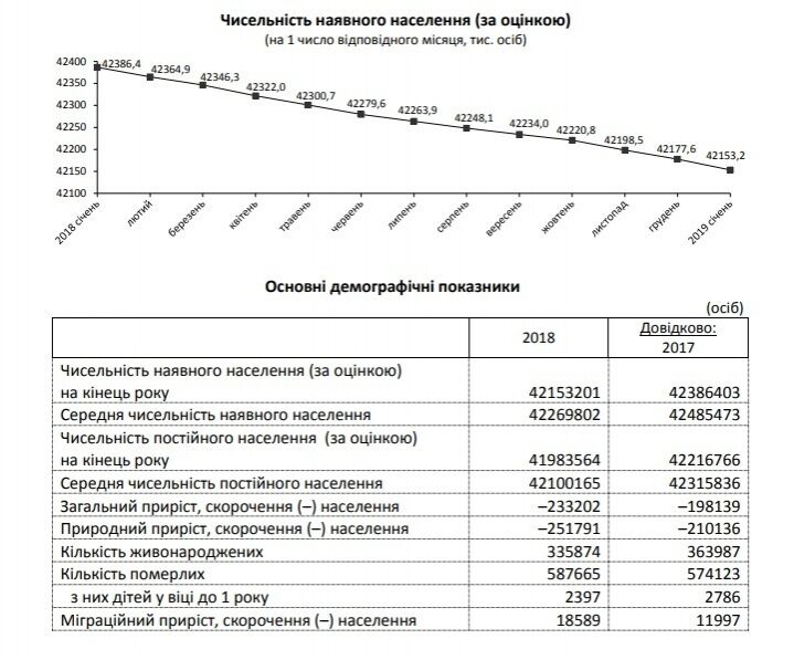 По состоянию на начало 2017 года население Украины составляло более 42,58 млн человек, а на начало 2018-го сократилось почти до 42,39 млн человек.