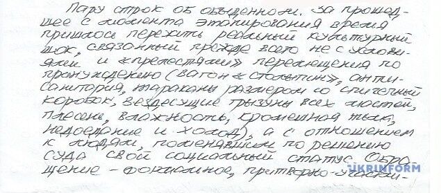 "Пару строк об обыденном. За прошедшее с момента этапирования время пришлось пережить культурный шок, связанный прежде всего не с условиями и "прелестями" перемещения по принуждению (вагон "столыпин", антисанитария, тараканы размером со спичечный коробок, вездесущие грызуны всех мастей, плесень, влажность, кромешная тьма, недоедание и холод), а с отношением к людям, поменявшим по решению суда свой социальный статус.