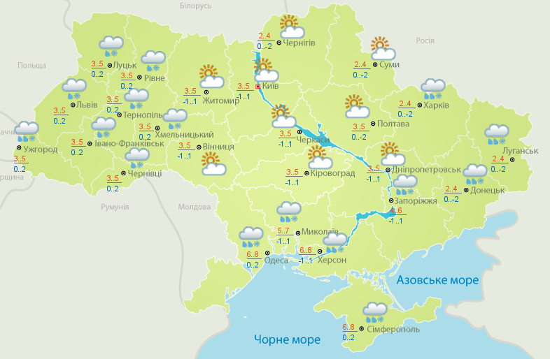 Как сообщает украинский Гидрометцентр, температура ночью составит от -2 до +1 °С, днем воздух прогреется до +3…+5 °С. В южных областях Украины будет немного теплее: +6…+8 °С.