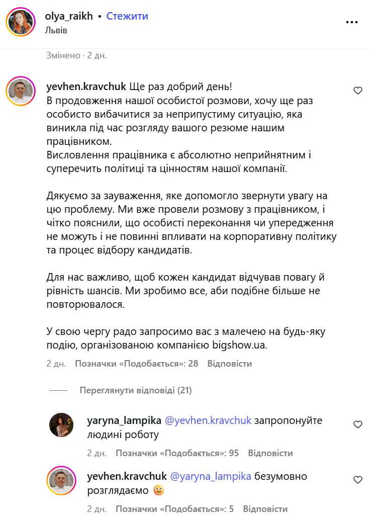 "Спасибо за замечание, которое помогло обратить внимание на эту проблему. Мы уже провели беседу с работником и четко объяснили, что личные убеждения или предубеждения не могут и не должны влиять на корпоративную политику и процесс отбора кандидатов. Для нас важно, чтобы каждый кандидат чувствовал уважение и равенство шансов. Мы сделаем все, чтобы подобное больше не повторялось", – написал он под постом Райх.