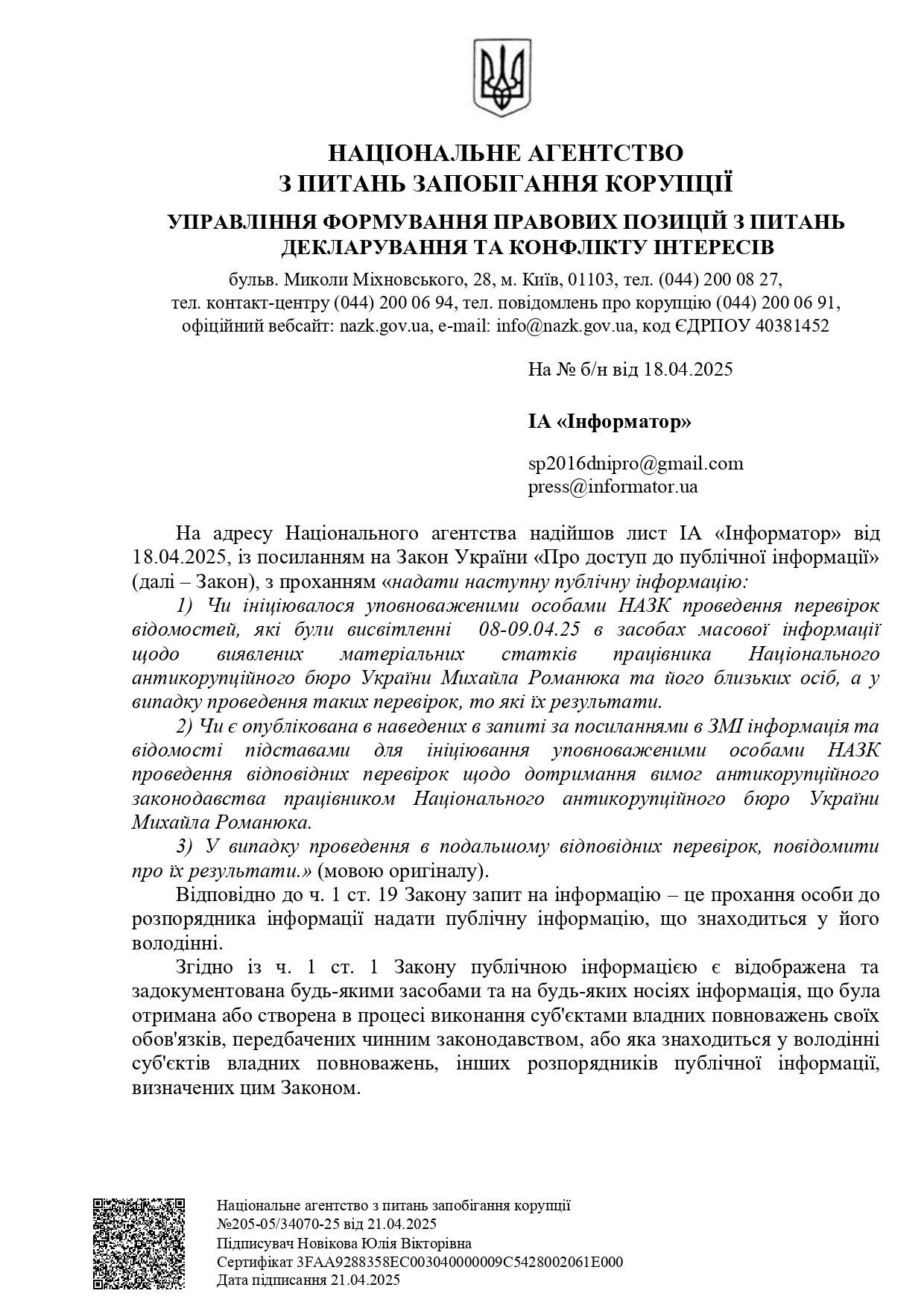 Национальное агентство по вопросам предотвращения коррупции (НАПК) и Святошинский райсуд Киева скрывают общественно важную информацию о руководителе одного из подразделений Национального антикоррупционного бюро Украины (НАБУ) Михаиле Романюке и его брате, обвиняемом во взяточничестве, написал портал Informator.ua.