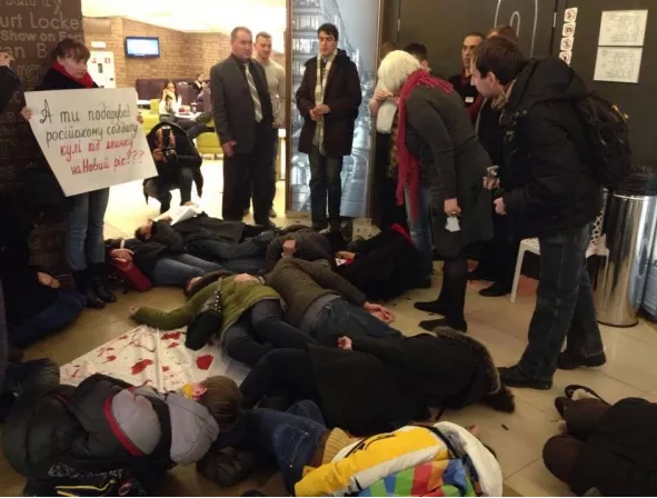 Активисты выстроились возле входа в ватниках и с плакатами – "Ты подарил российскому солдату пули под елку на Новый год?", "Сходил на Елки – убил украинского солдата". Участники перформанса выложили собственными телами "кровавую дорожку" на входе в кинотеатр в знак того, что показ российского кино финансирует армию, которая осуществляет военную агрессию на востоке Украины.