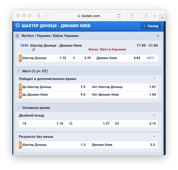 В букмекерской конторе "Фавбет" уверены, что и в этот раз победит "Шахтер". Ставки на победу донецкой команды принимаются с коэффициентом 1,72, тогда как на победу "Динамо" – с коэффициентом 4,85 (чем ближе коэффициент к единице, тем выше вероятность, что это произойдет).
