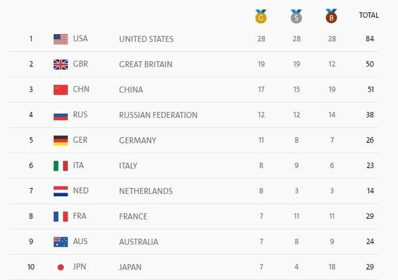 Абсолютным лидером остается команда США. У американцев 84 медали – 28 золотых, 28 серебряных и 28 бронзовых.