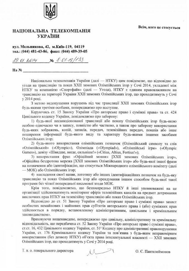 НТКУ разместила на сайте также копию обращения, официально адресованного "всем, кого это касается", которое, в частности, содержит еще ряд требований. Как то – канал со ссылкой на ст. 15 Закона Украины "Об авторском праве и смежных правах" и ст. 424 Гражданского Кодекса запретил другим СМИ и "всем, кого это касается" использовать официальный символ Олимпиады, а также слов "Олимпиада", "Олимпийский" , "Олимпийские игры" и девиз "Быстрее, выше, сильнее".