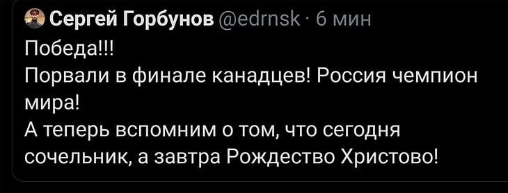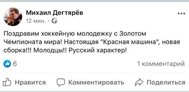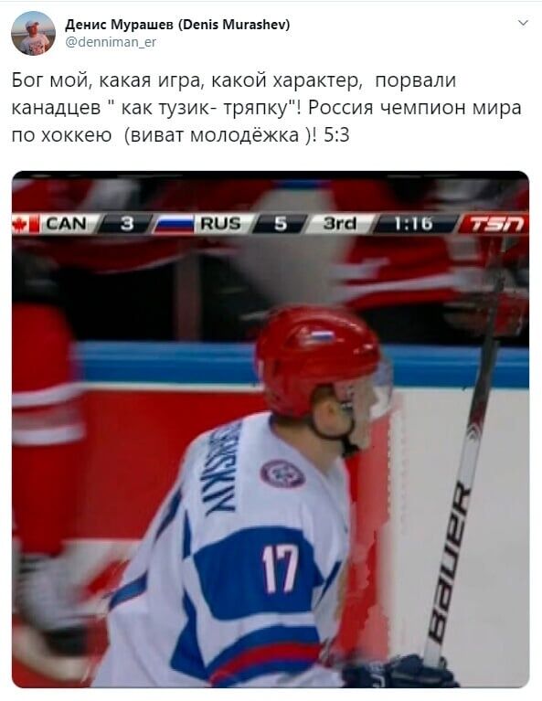 Среди тех, кто поверил в победу сборной России над Канадой в финале молодежного чемпионата мира по хоккею, – российский футболист Дмитрий Тарасов, глава комитета российской Госдумы по физкультуре, спорту, туризму и делам молодежи Михаил Дегтярев и ресурс "Москва 24".