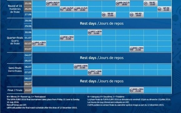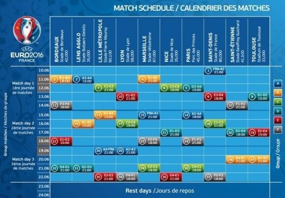 Все футбольные игры Евро-2016 будут начинаться в 16.00, 19.00 и 22.00. Команды не будут закреплены за определенным городом – все сборные проведут свои матчи группового этапа в разных городах, что позволит местным жителям увидеть своими глазами как можно больше сборных.
