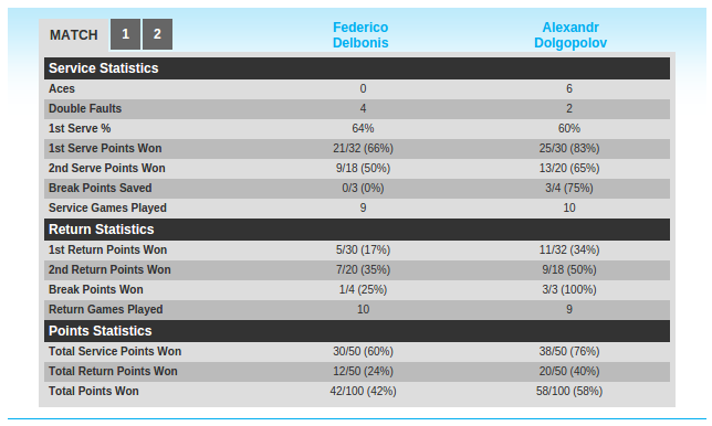 Матч длился 1 час 5 минут. На счету Долгополова шесть эйсов и две двойные ошибки. Украинцу удалось сделать три брейка, тогда как его сопернику – один.