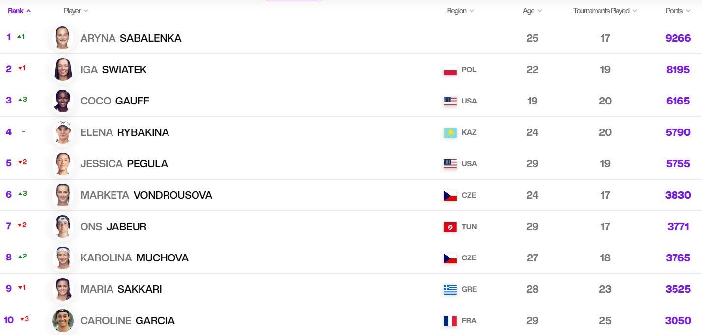 Первой ракеткой мира стала Арина Соболенко из Беларуси, оттеснив на второе место Игу Швентек из Польши.