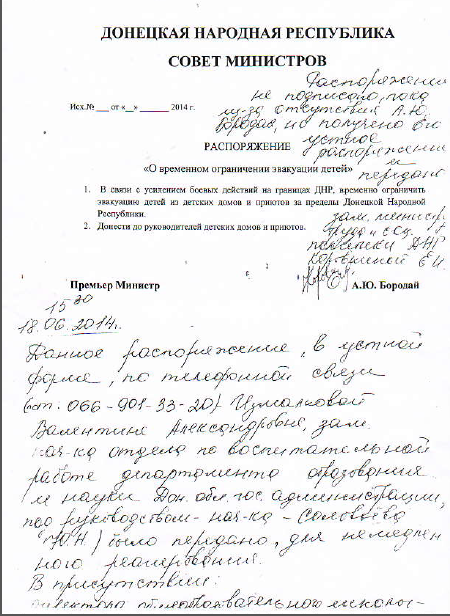 Террористическая организация "Донецкая народная республика" издала "постановление", в котором призывает "временно ограничить эвакуацию детей из детских домов" в зоне АТО. Фотография этого "постановления" размещена на официальной странице портала "Сиротству – нет!" в Facebook, сообщают "Новости Донбасса". В настоящее время страница недоступна в социальной сети.