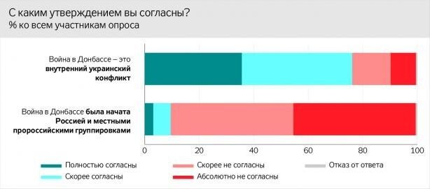 "Жители ОРДЛО определились с названием вооруженного конфликта в Украине. 76% "полностью согласны" и "скорее согласны" с тем, что война на Донбассе – это внутренний украинский конфликт (35,6% и 40,5% соответственно)", – отмечает издание.