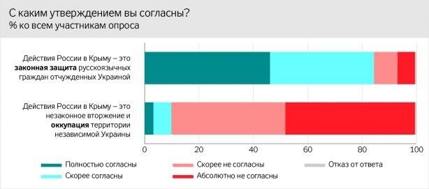 Более 80% опрошенных так или иначе согласны с утверждением, что "действия России в Крыму – это законная защита русскоязычных граждан, отчужденных Украиной". С тем, что действия РФ в 2014 году в Крыму – это незаконное вторжение и оккупация территорий независимой Украины, согласны около 10% респондентов.