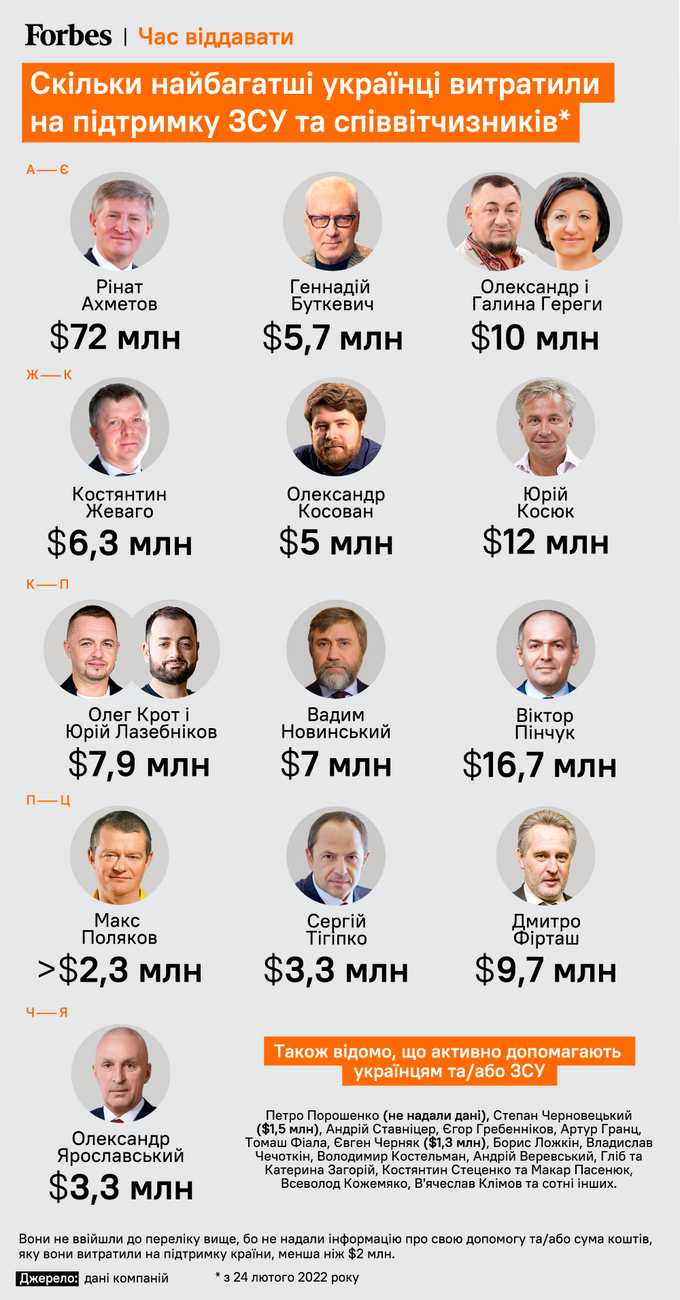 В списке также – совладелец АТБ Геннадий Буткевич, который потратил на помощь $5,7 млн, владельцы "Эпицентра" Александр и Галина Гереги ($10 млн), собственник Ferrexpo Константин Жеваго ($6,3 млн), Виктор и Елена Пинчук ($16,7 млн и $3,5 млн, собранных через Ukraine Relief Fund) и ряд других бизнесменов.