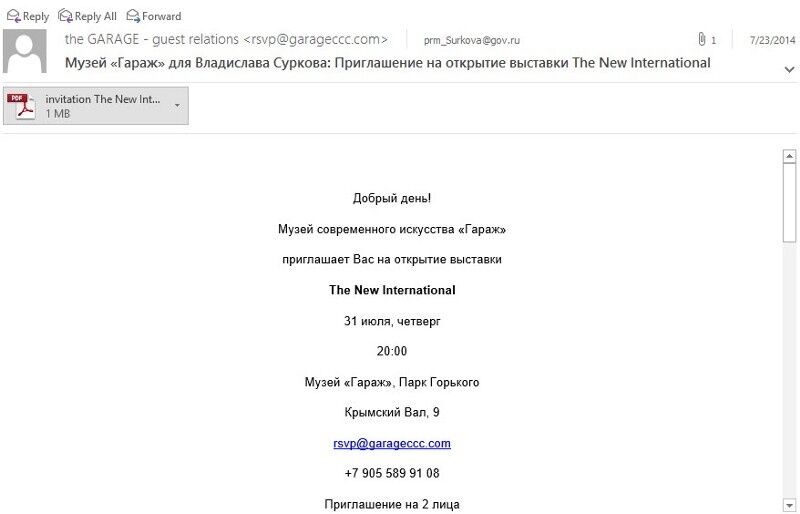 Ящик, который приписывается Суркову, полностью отвечает этому критерию, считают эксперты. В письмах и файлах – немало отсылок к обычным делам чиновника. Отдельные события легко подтверждаются, например – приглашение на выставку New International в Музее современного искусства Москвы, которая действительно имела место.