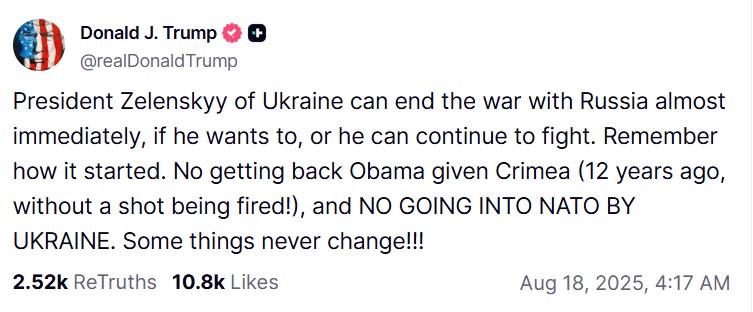 "Президент Украины Зеленский может почти сразу же закончить войну с Россией, если захочет, или продолжать воевать. Вспомните, как все началось. Нельзя вернуть Крым, который отдал [экс-президент США Барак] Обама (12 лет назад, без единого выстрела!), и Украина не может вступить в НАТО. Некоторые вещи никогда не меняются", – отметил Трамп.