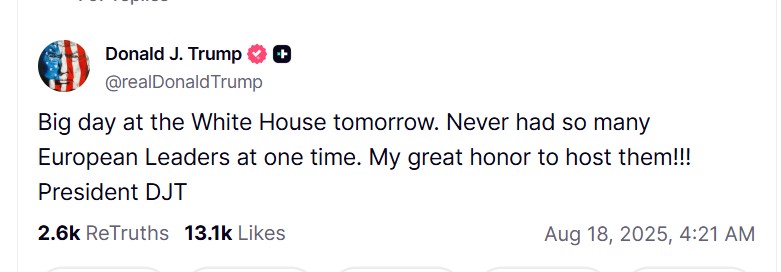 "Завтра [18 августа] великий день в Белом доме. Еще никогда не было столько европейских лидеров одновременно. Для меня большая честь принимать их", – подчеркнул американский президент.