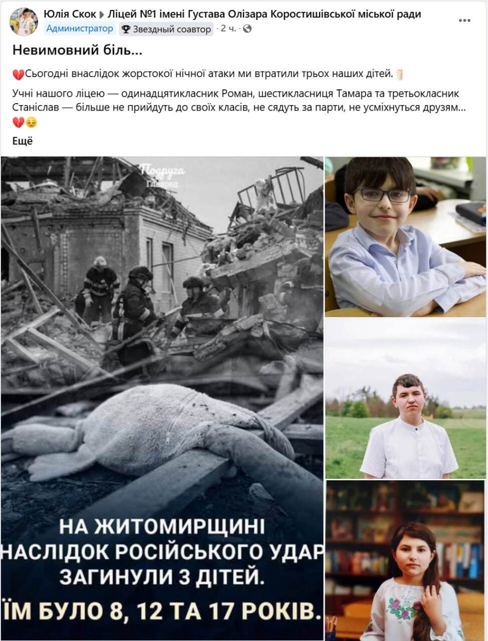 "Сегодня в результате жестокой ночной атаки мы потеряли троих наших детей. Ученики нашего лицея – одиннадцатиклассник Роман, шестиклассница Тамара и третьеклассник Станислав – больше не придут в свои классы, не сядут за парты, не улыбнутся друзьям… У Ромы через считаные дни должен был состояться выпускной – день, которого он ждал с надеждой и мечтами. А у его младших брата и сестры впереди было столько первых звонков, экскурсий, праздников, открытий, счастливых моментов детства… Но все это оборвала война. Нам больно. Всей школьной семье", – говорится в сообщении.