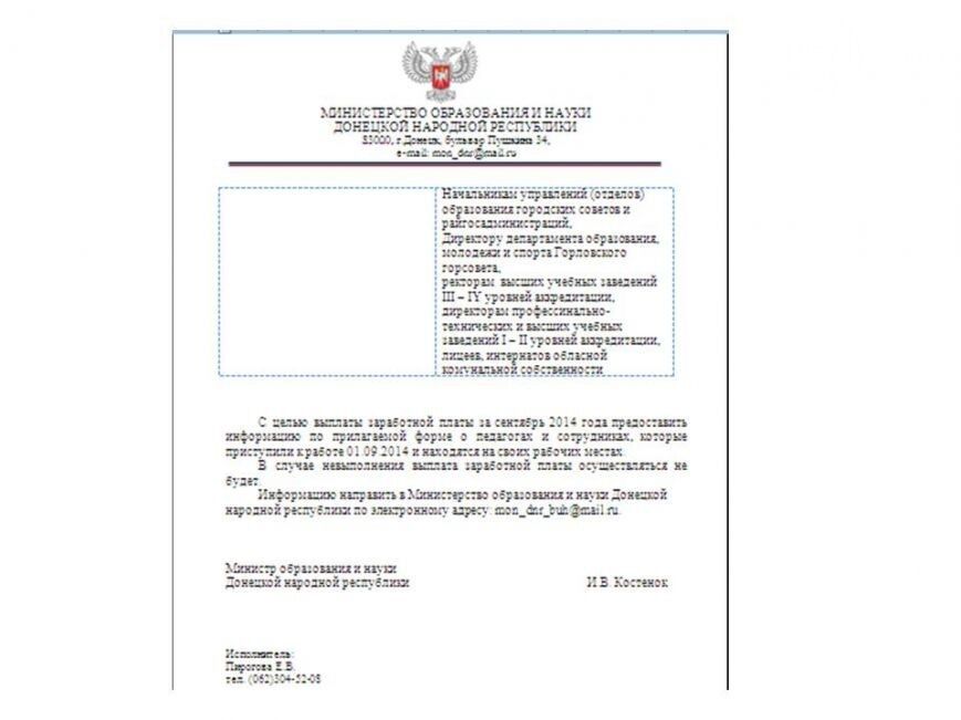 Министр образования и науки "ДНР" Игорь Костенок запросил списки преподавателей "с целью выплаты заработной платы за сентябрь 2014 года".