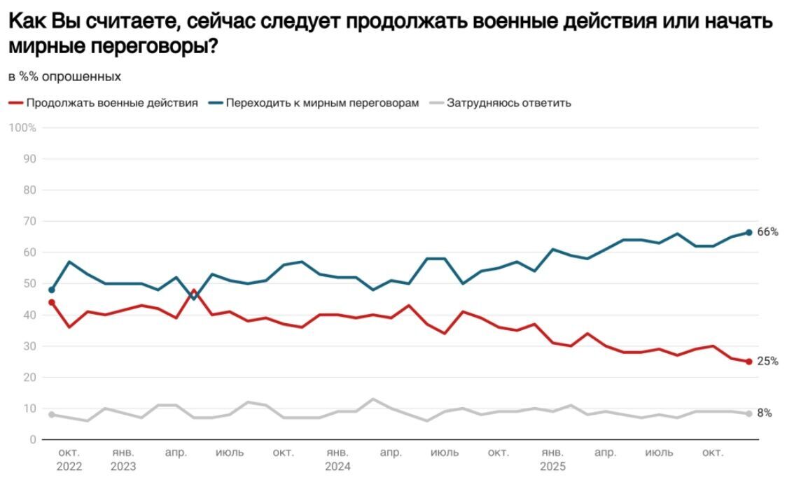 "Доля тех, кто считает, что сейчас нужно переходить к мирным переговорам, за последние месяцы выросла и достигла двух третей опрошенных (66%). [...] Одновременно с этим доля тех, кто думает, что нужно продолжать военные действия, снижается – до четверти опрошенных (25%) – это минимальное значение за все время наблюдений", – говорится в материале.
