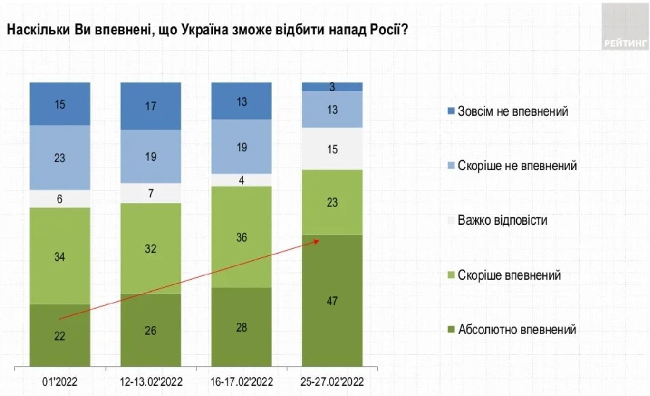 "Абсолютно уверены" в способности Украины отбиться 47% респондентов, еще 23% – "скорее уверены".