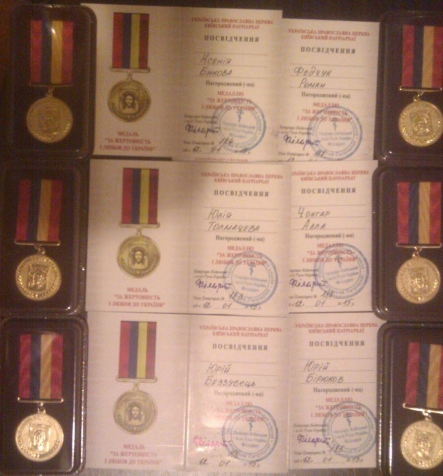 Медаль "За жертовнiсть та любов до України" от главы Украинской православной церкви Киевского патриархата Филарета получили Ксения Быкова, ЮлияТолмачева, Алла Борисенко "Чонгар", Юрий Бирюков и Юрий Беззубец.