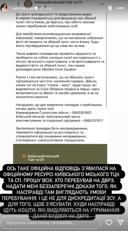 После ответа ТЦК блогер обратилась ко всем, кто находился на ДВРЗ, с просьбой предоставить ей безопасные доказательства того, какие на самом деле условия содержания. Она заявила, что собирает материалы для дальнейшего расследования ситуации.