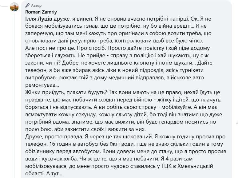 "Я виноват. Я не обновил вовремя нужные бумажки. Ок. Я не боялся мобилизоваться и знал, что это нужно, ну, потому что война, в конце концов... Я не отрицаю, что там мне говорят об оригиналах: с собой возить надо, что обновлять данные регулярно надо, контролировать, чтобы все было четко", – отметил Замрий.