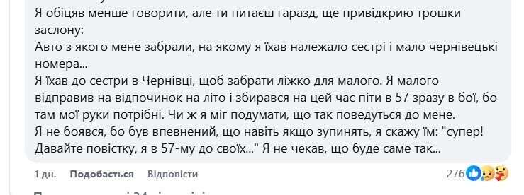 "Просто дайте повестку и пусть пойдет домой соберется и служит. Не придет – дело в полицию и пусть ищут, ну, есть же законы, или нет? [...] Я ехал к сестре в Черновцы, чтобы забрать кровать для малого. Я малого отправил на отдых на лето и собирался на это время пойти в 57-ю [отдельную мотопехотную бригаду ВСУ] сразу в бои, потому что там мои руки нужны. Разве я мог подумать, что так отнесутся ко мне", – объяснил он.