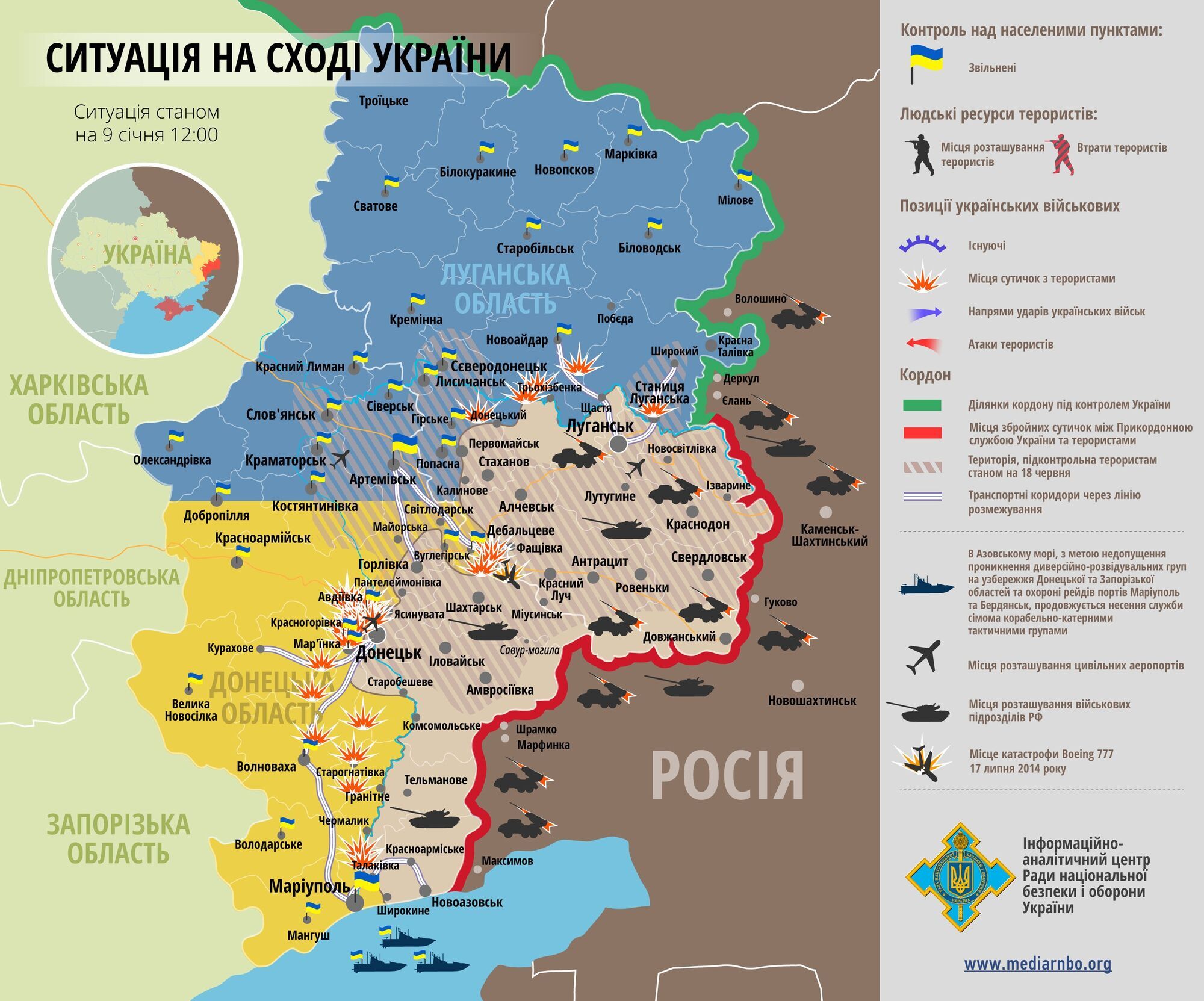 Карта АТО: Террористы наносят удары вдоль всей границы зоны АТО