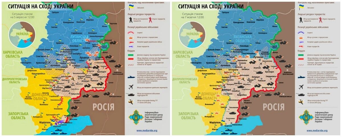 Спикер информационного центра Совета национальной безопасности и обороны Украины (СНБО) Андрей Лысенко не раз заявлял, что с 5 сентября, когда было провозглашено перемирие, силы антитеррористической операции не сдали свои позиции и не отступили ни на метр. Вместе с тем, согласно картам, которые составляет СНБО, за прошедший месяц контролируемая украинскими войсками территория сократилась.