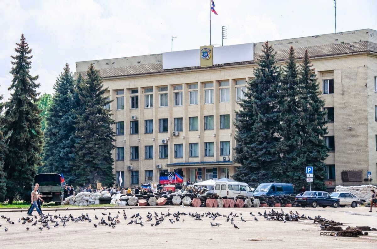На центральной площади города здание администрации было украшено баррикадами и флагами "ДНР".